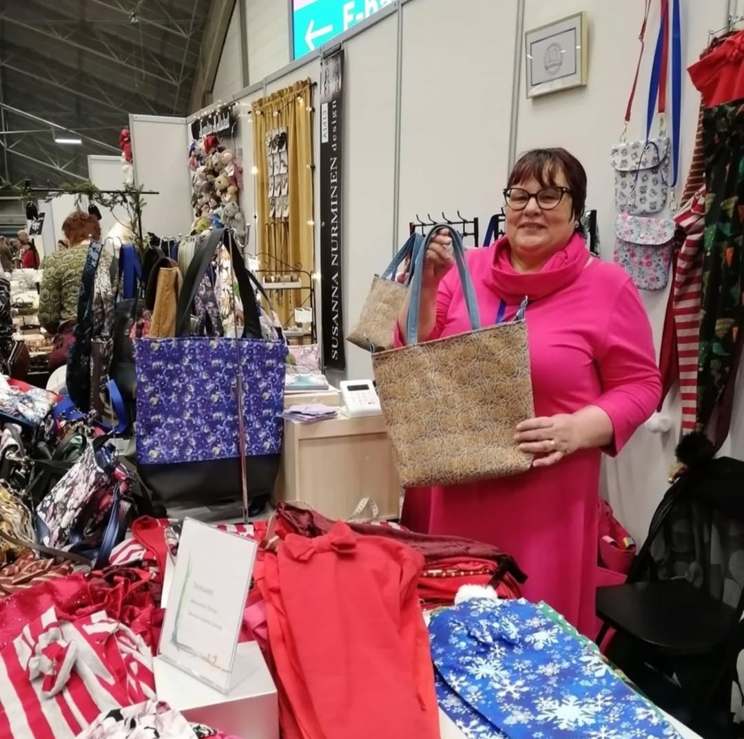Värikkäitä, uniikkeja erikokoisia laukkuja, reppuja.